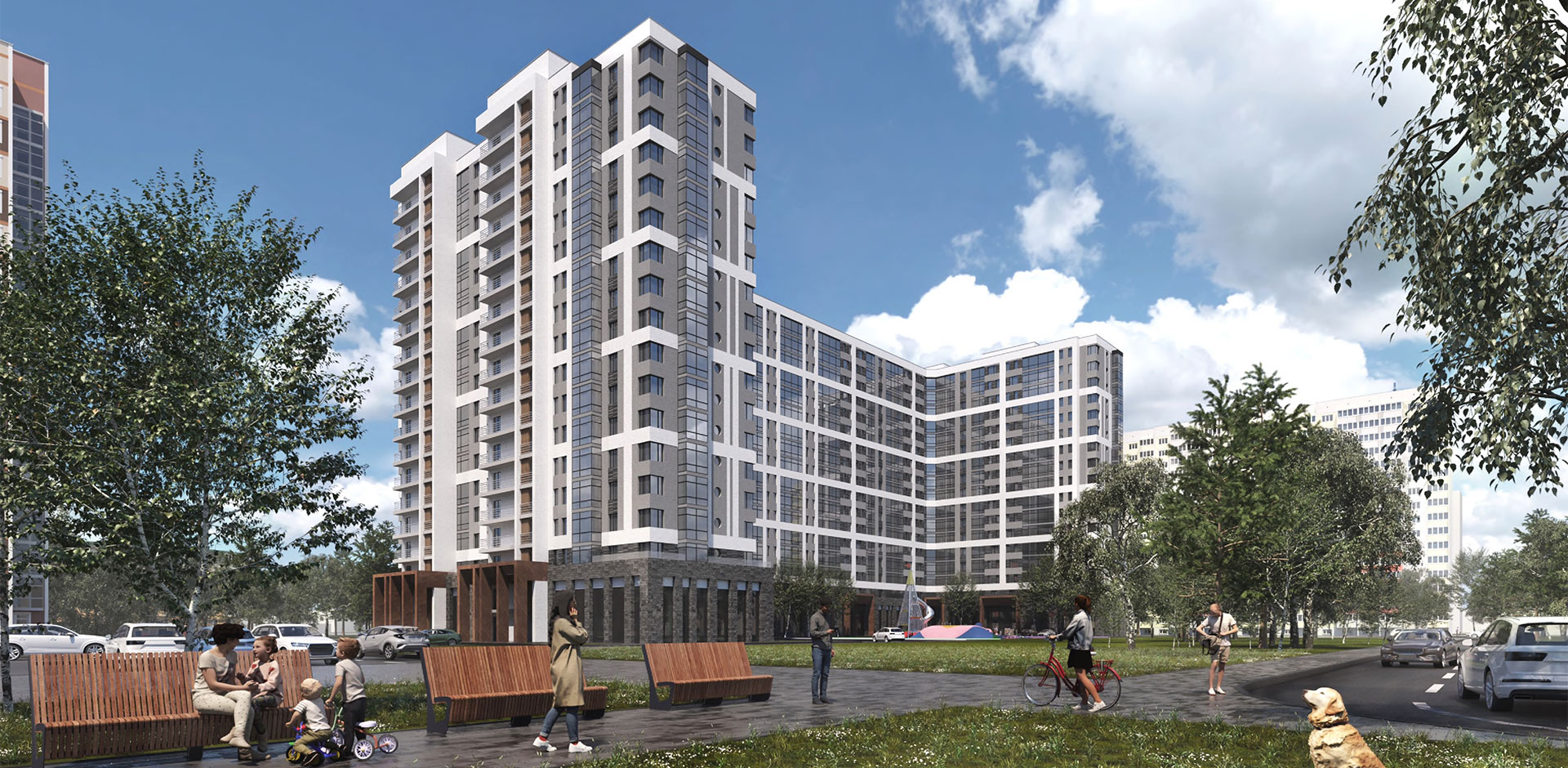Придомовая территория оборудована всем необходимым для комфортного проживания: детские и спортивные площадки, парковка, места отдыха. Рядом расположены магазины, сервисы, образовательные учреждения, разнообразные благоустроенные природные зоны. Напротив сквер Победы, в 15 минутах ходьбы культурные центры, аллеи, набережная и храм.